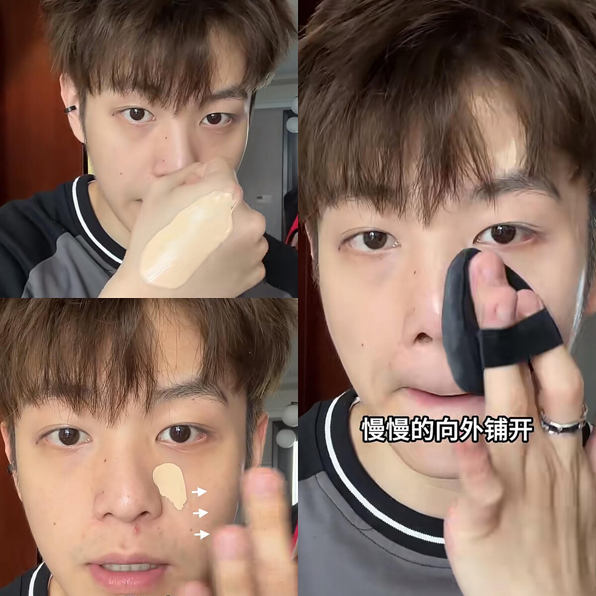 選擇適合自己膚色的粉底液或BB霜,輕輕地均勻塗抹於臉部,注意避開眼周。男生妝容偏向自然,選擇薄透的底妝產品,可以展現肌膚的原生狀態又能達到簡單提亮修飾的效果。