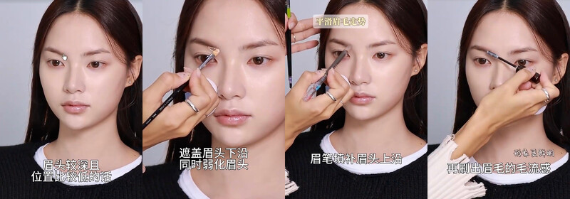 Haemin老師提到,要強調五官的立體度,才會有整個人看起來很緊、很精緻的感覺,尤其是下顎線、鼻影都會特別著重,另外就是眉毛的話,為了讓線條平滑流暢,會在眉頭下方視需求運用遮瑕膏調整線條。