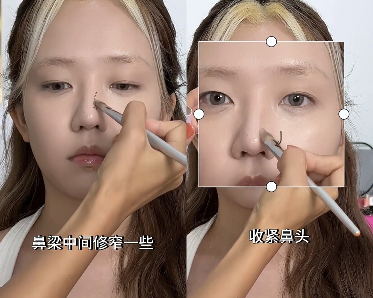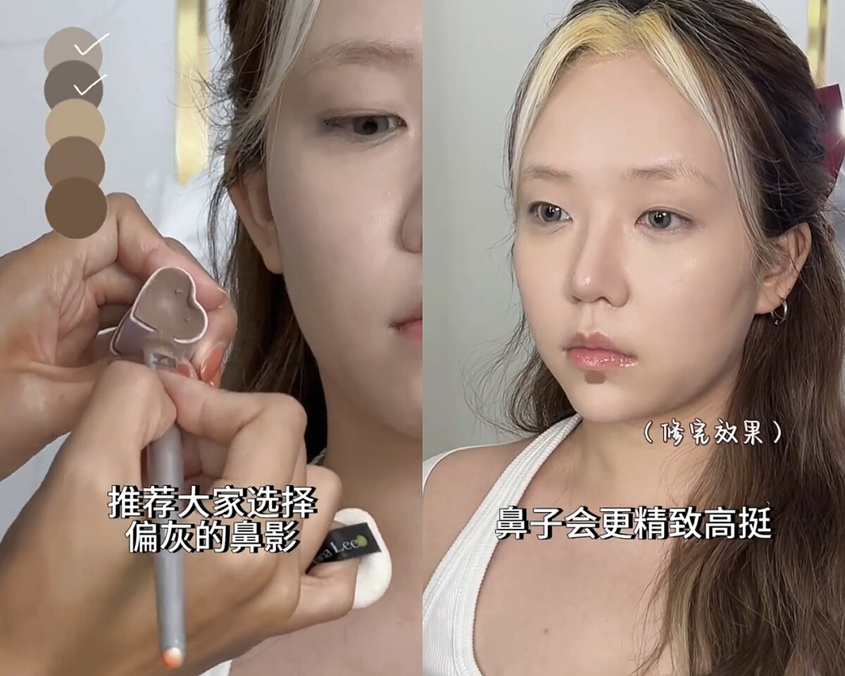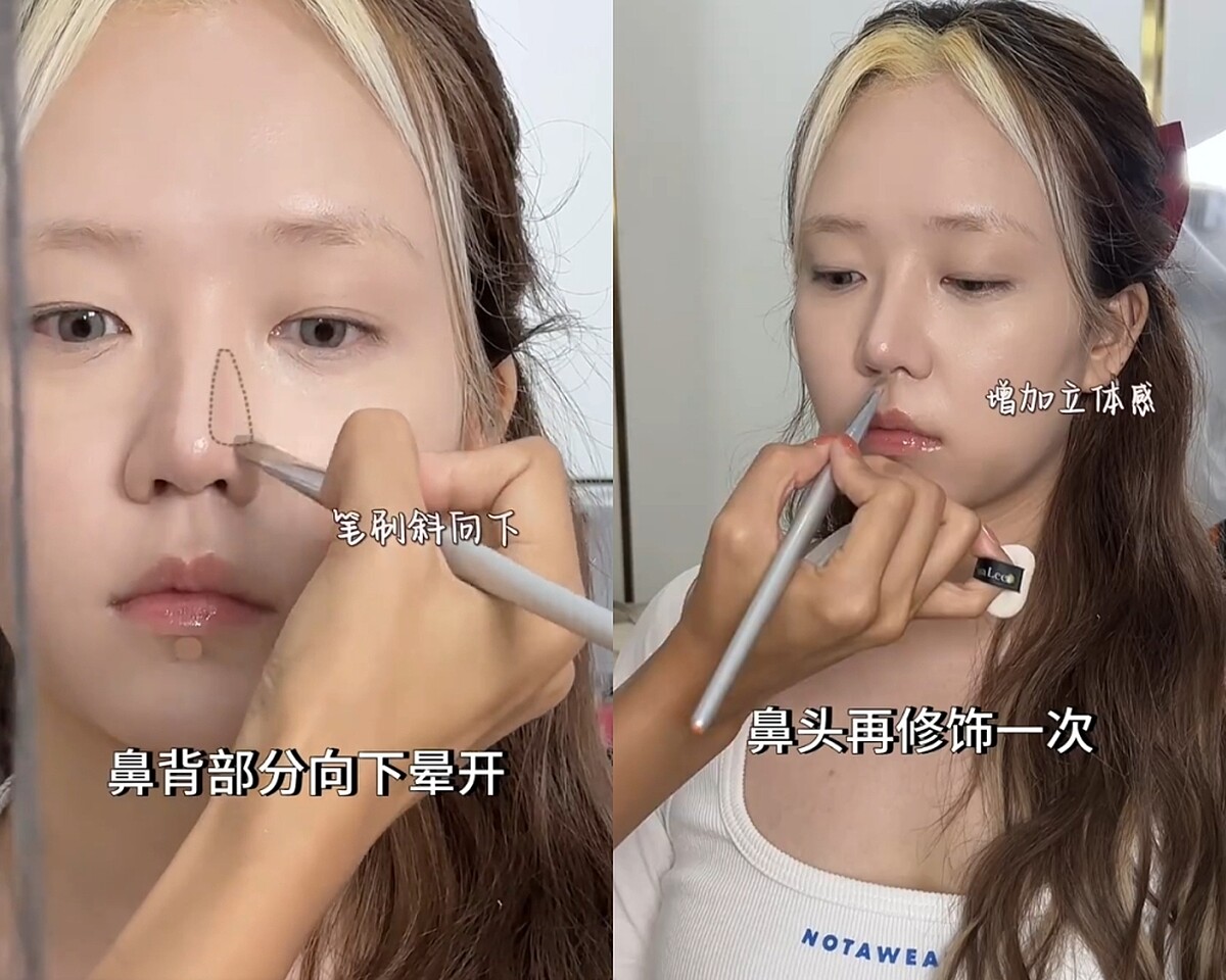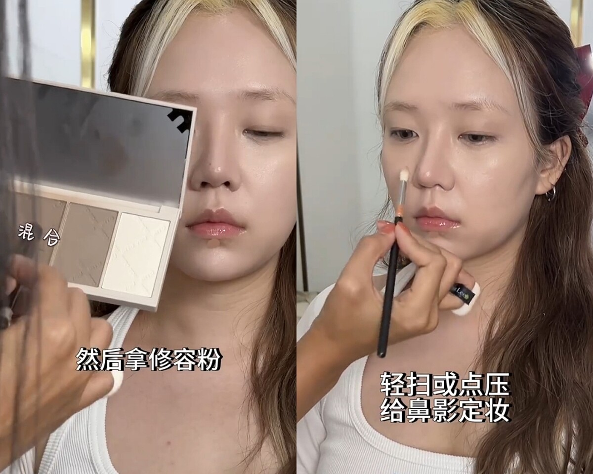 千萬別忘了暈染開來的動作,從鼻背位置向下暈開,Haemin彩妝師強調要讓筆刷以「斜下」方向將邊界線暈染,再搭配海綿拍開,最後可以再加強鼻頭的修容,完成後自然的女團直鼻已經有基本的雛型了。