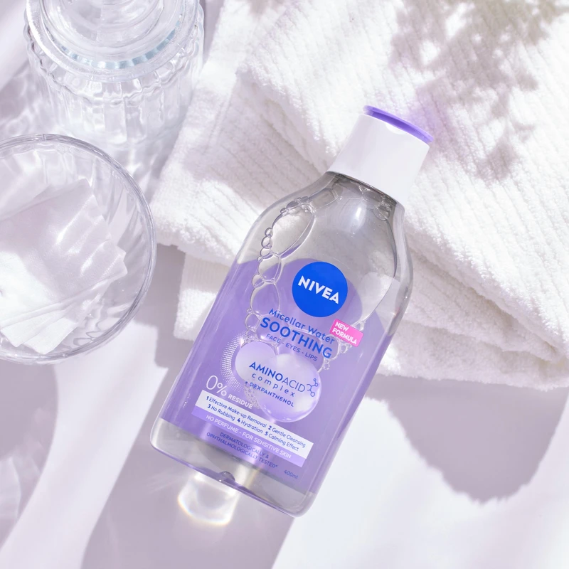 許多舒緩修護保養品中都會用的醫美級成分維他命B5,妮維雅特別將它加入卸妝水中,給予肌膚修護乾燥刺激、舒緩敏感泛紅的效果,使肌膚在卸妝過程中更舒適且膚況保持穩定,自然不會引發粉刺、悶痘、粗糙顆粒感,達成卸妝同時穩膚的兩大重要任務。