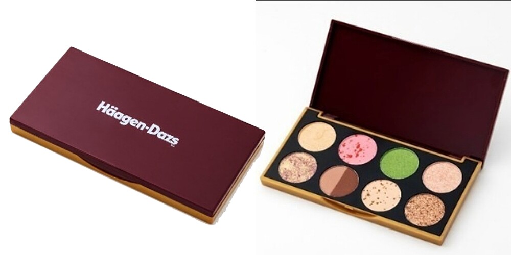 眼影盤外殼採用哈根達斯經典的酒紅色,裡頭一共有八色眼影,顏色靈感來自哈根達斯熱銷的迷你杯冰淇淋口味,像是香草、草莓、夏威夷果仁都在裡頭。