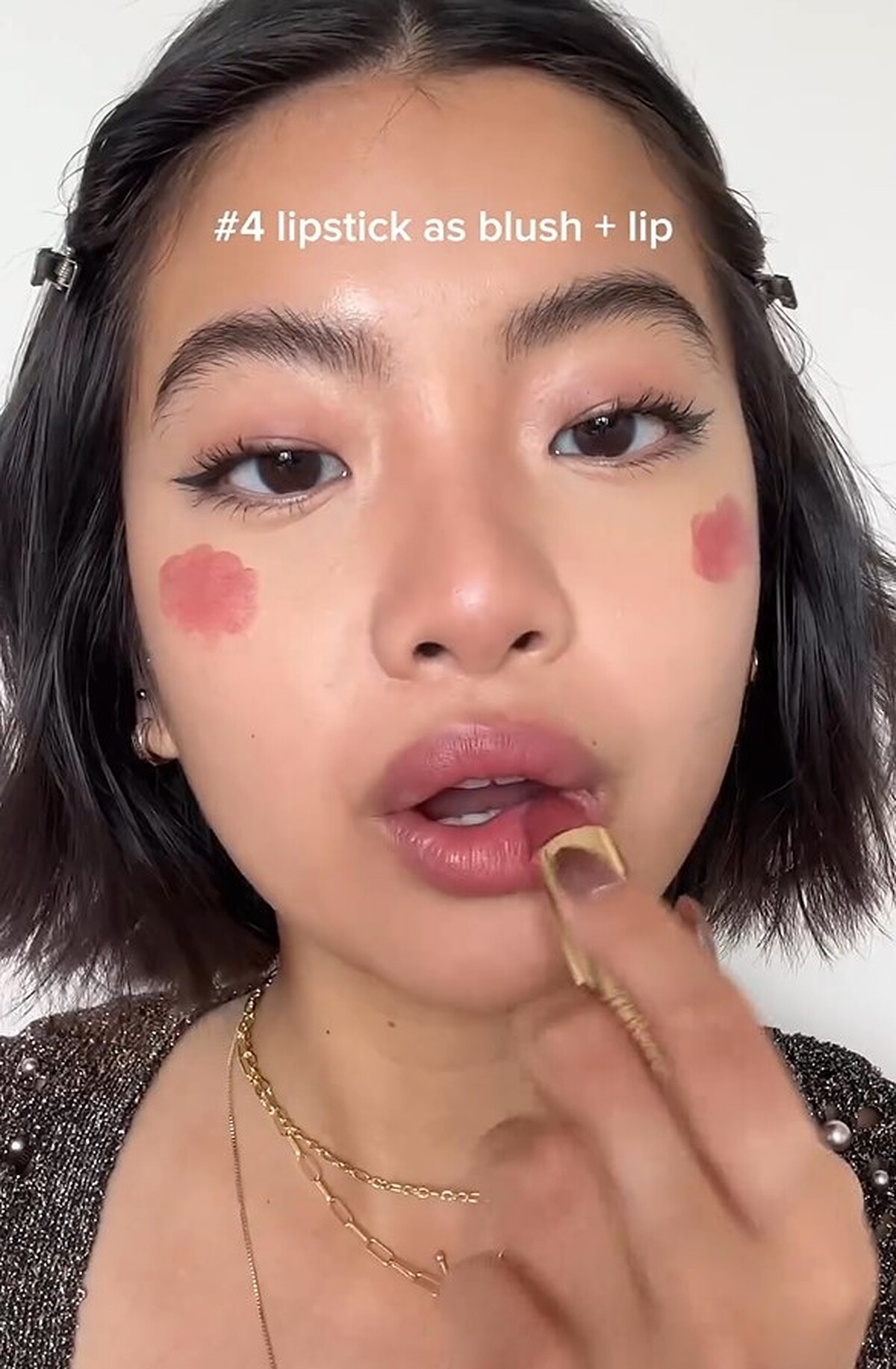 加快妝容的基本技巧就是這招,將口紅塗在雙頰和嘴唇上,並用手指暈開以增添色彩,遲到急救妝就大功告成。