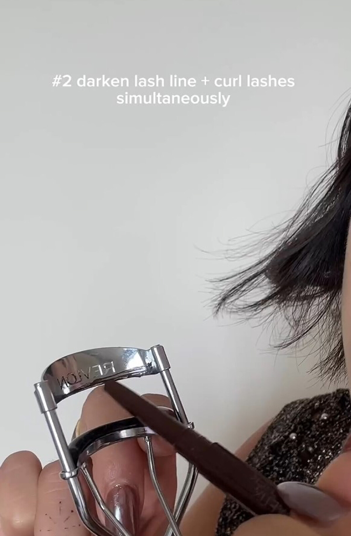 將眼線筆畫在睫毛夾夾住睫毛的內側,然後直接使用睫毛夾,即可獲得自然的眼線,簡直就是一舉兩得的效果,打造完美捲翹睫毛又同時得到自然眼線,迅速刷上睫毛完成眼妝。