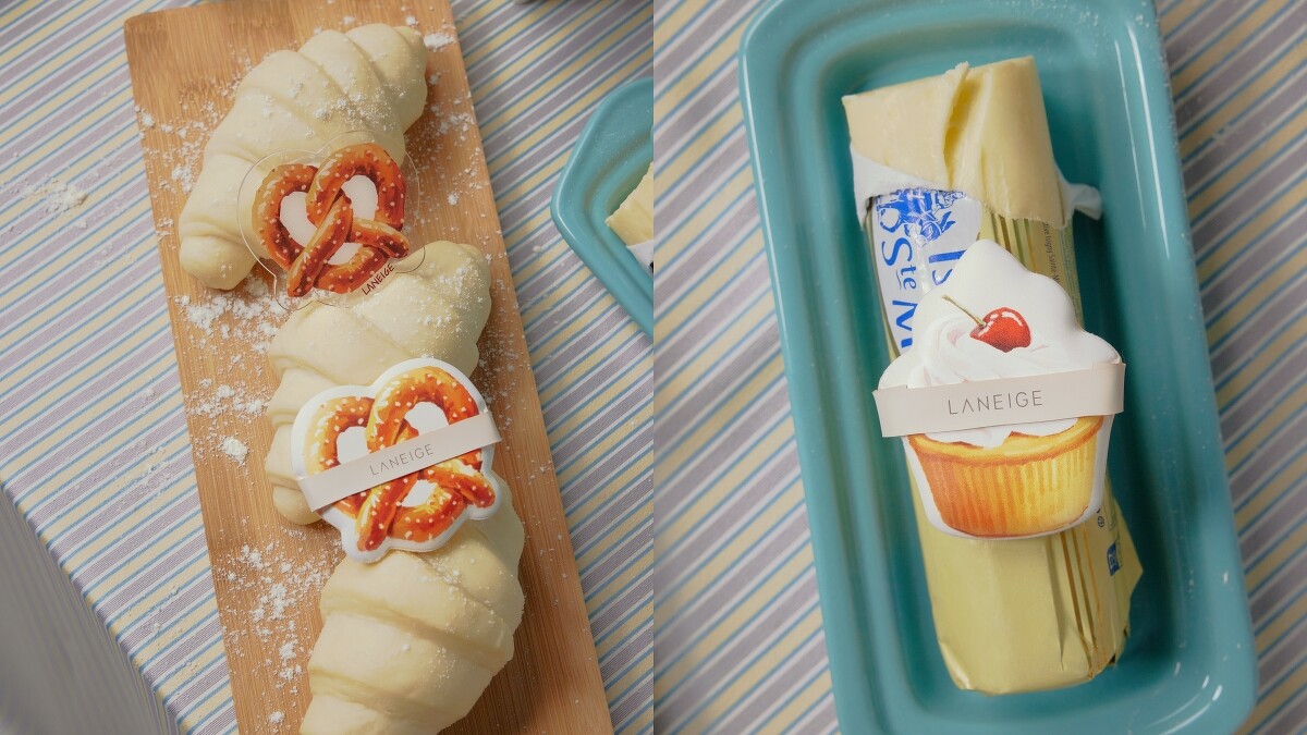 氣墊外盒的奶油色,搭配美式街頭國民烘焙美食「蝴蝶餅、杯子蛋糕、法式可頌」等圖案,看起來超級可愛。