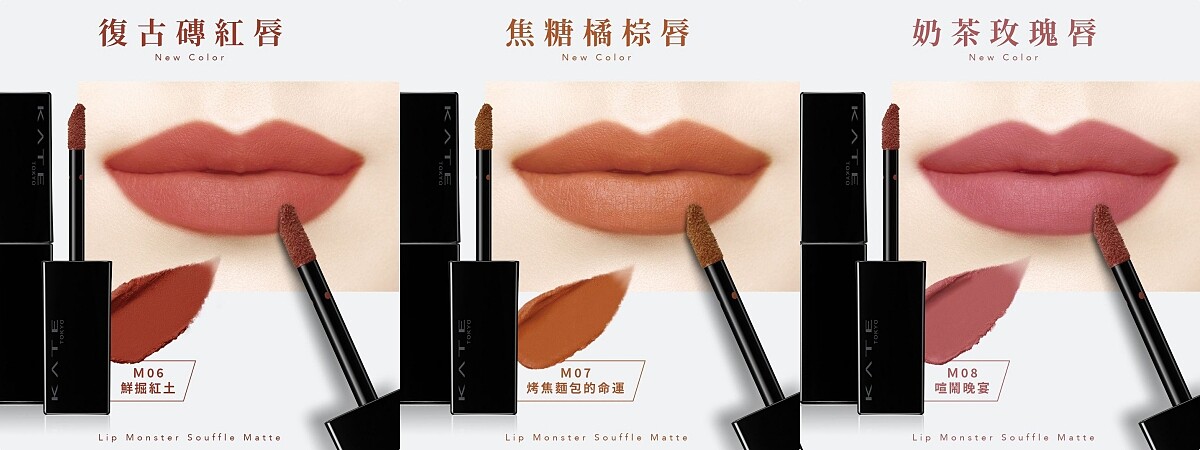 繼造成網路社群討論熱潮不斷的現象級「怪獸級持色唇膏」後,Kate凱婷再推輕盈柔霧妝效的舒芙蕾感霧面唇釉「怪獸級持色絨霧唇釉」全新色號。