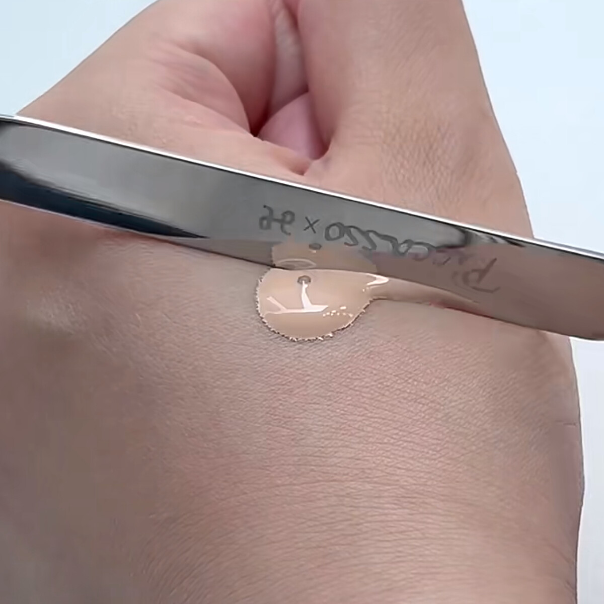 以圓潤滑順的高品質不鏽鋼材質製成,邊緣不刮臉不拉扯肌膚,無需任何技巧即能以少量均勻用量如奶油抹刀般由內而外平撲上臉,多層疊加也不厚重結塊。