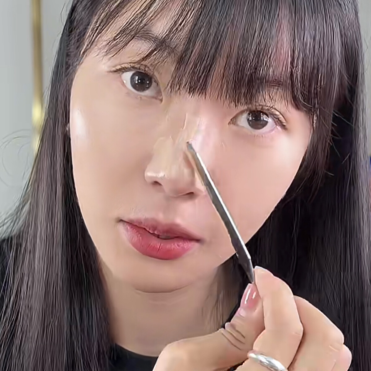 鼻子上的毛孔較明顯,使用粉底抹刀稍微用點力,像把毛孔填滿一樣均勻上好粉底液就可以。後續同樣以粉撲輕拍均勻。