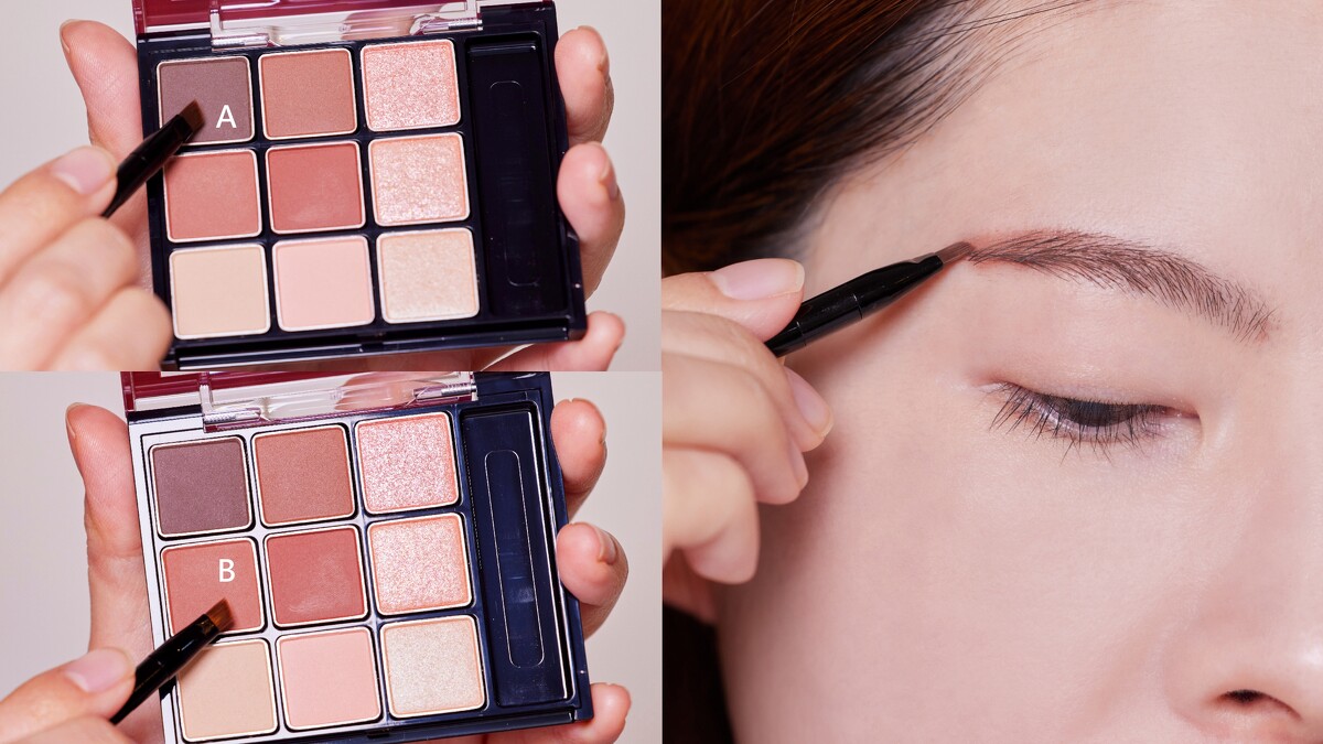 用眉刷將A+B混合後,先在手背處等調整粉量讓顏色更自然,從眉峰往眉尾描繪纖細線條,眉型更加俐落。