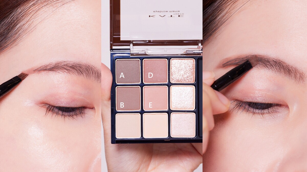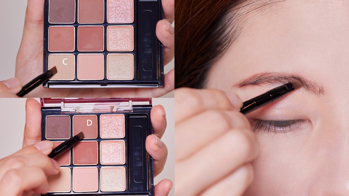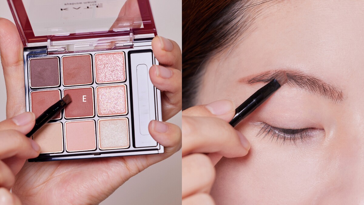 接著用C+D調和的淡色系暈染眉頭,再疊擦E,創造出具層次的立體眉妝。