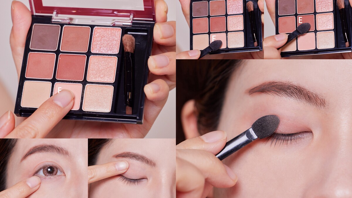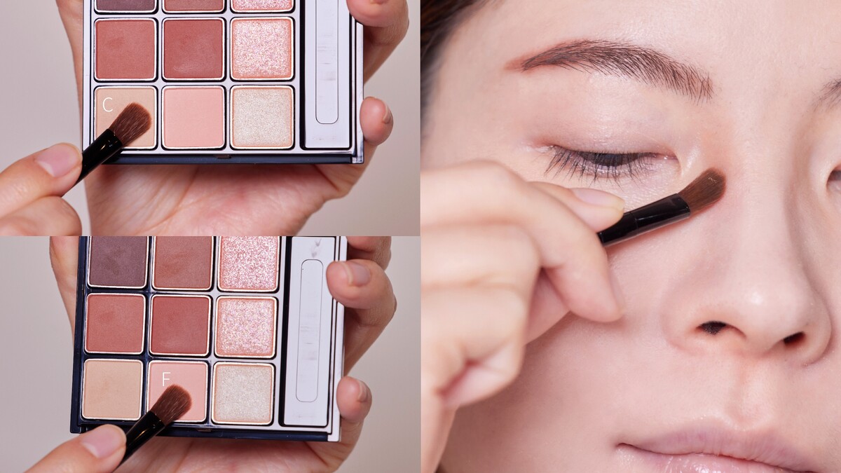 以指尖沾取F暈抹於上下眼皮,提亮整個眼周,看起來自然粉嫩。接著混合E+F暈染於上眼皮,製造出深邃感。
