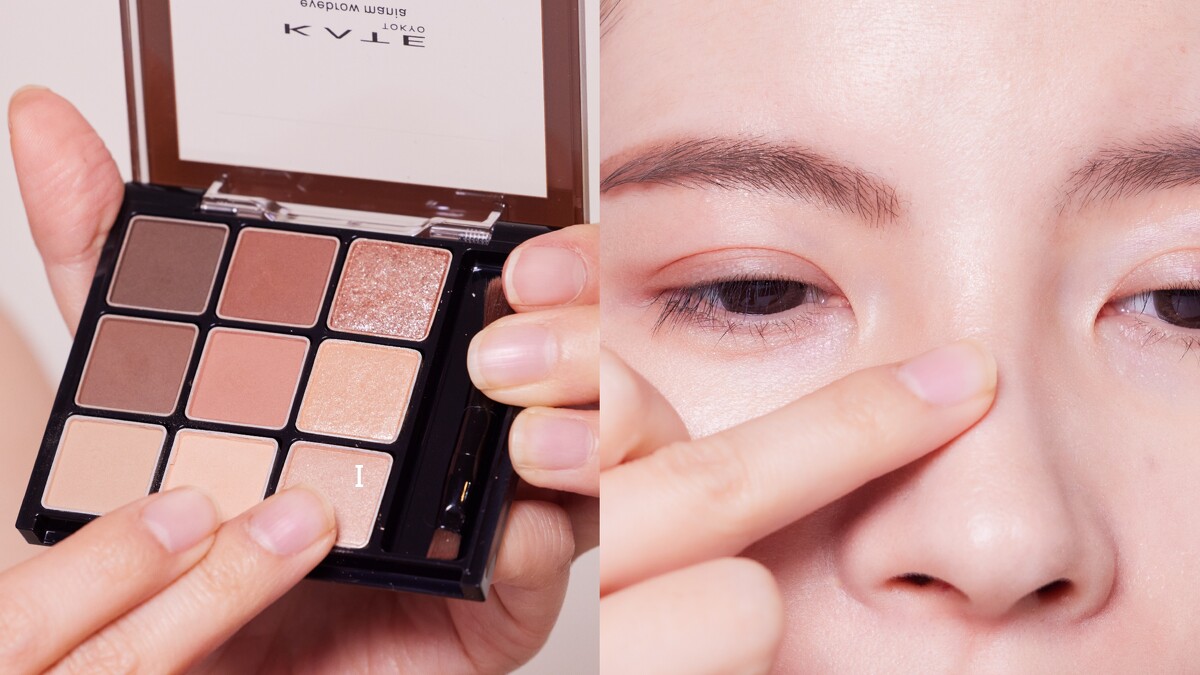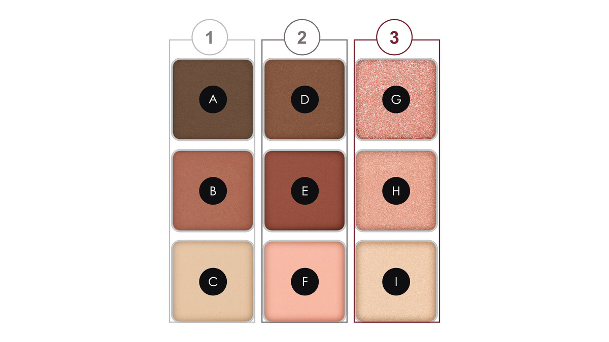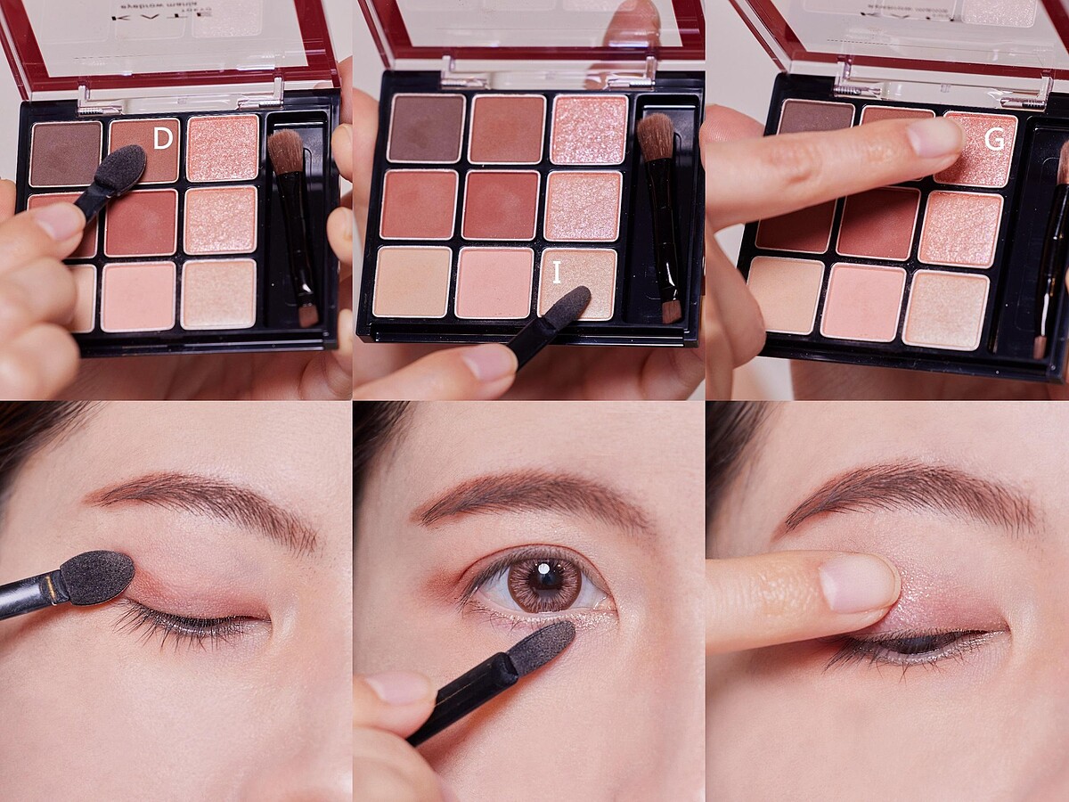 沾取D稍微點綴於眼尾,營造自然漸層。沾取I塗抹於眼頭打亮,放大雙眸。以指尖沾取G暈抹於上眼皮中央,細緻亮片低調閃耀。