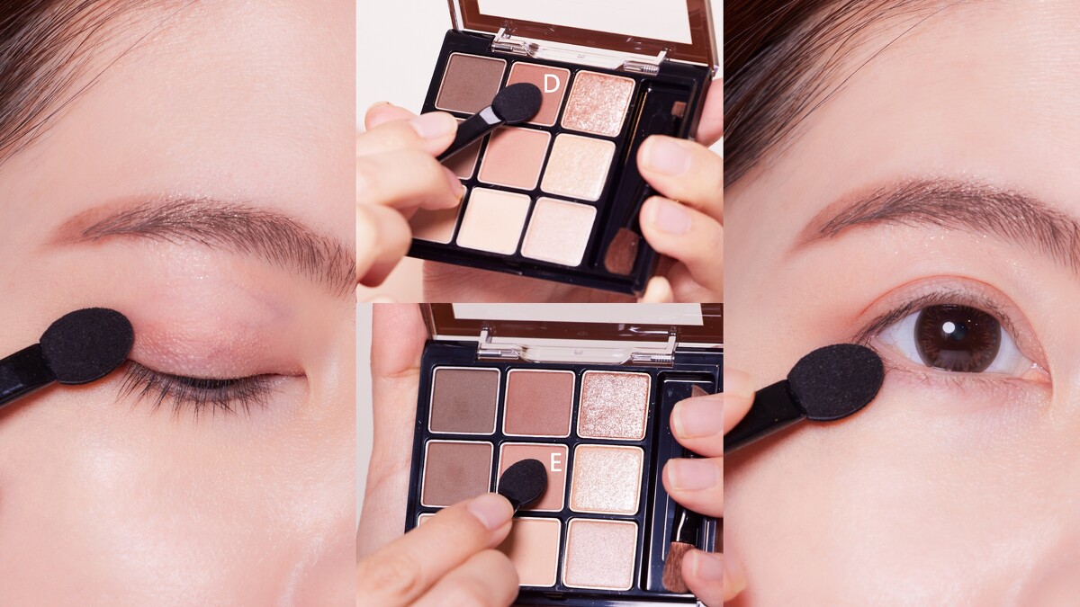 用眼影棒粗邊沾取D暈抹於上眼皮處,接著將E暈染於下眼皮,打造出自然有神的魅力眼妝。