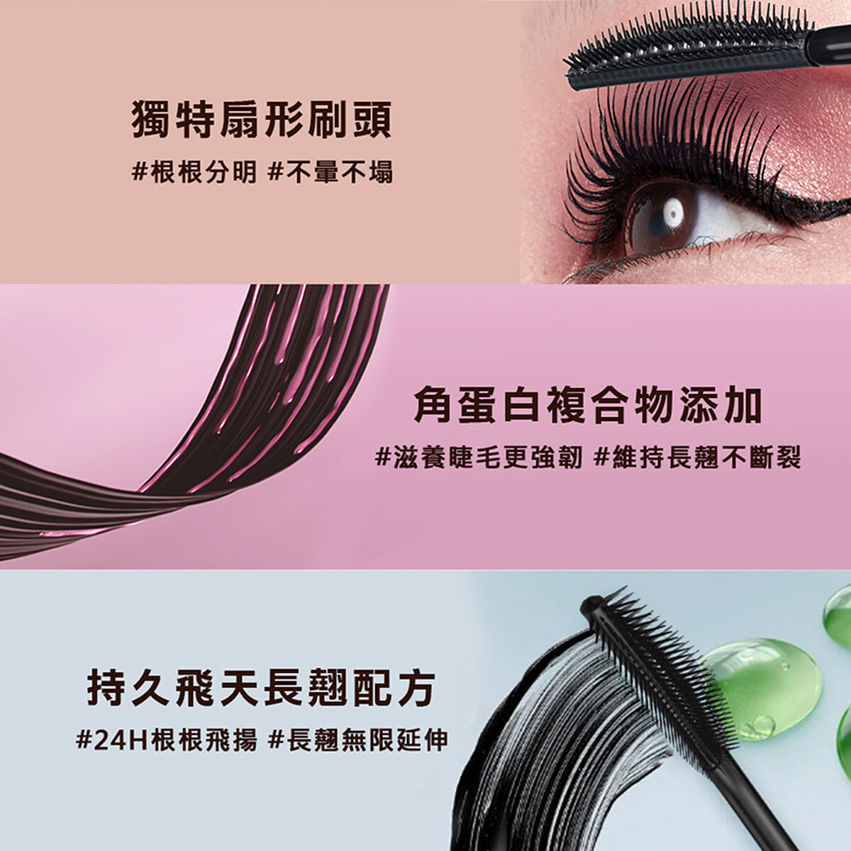 創造炸飛感睫毛的關鍵,來自「飛天翹防水睫毛膏」的特別成分及刷頭。採用獨家24H飛天瞬翹科技,膏體輕盈持久長翹,長時間防水不暈妝,搭配輕盈且持久飛天長翹膏體,一刷立即纖長飛翹,使用後睫毛瞬間無限延伸。其中更全新添加角蛋白複合物,擦睫毛的同時讓睫毛更強韌捲翹,維持長時間持久根根飛揚!