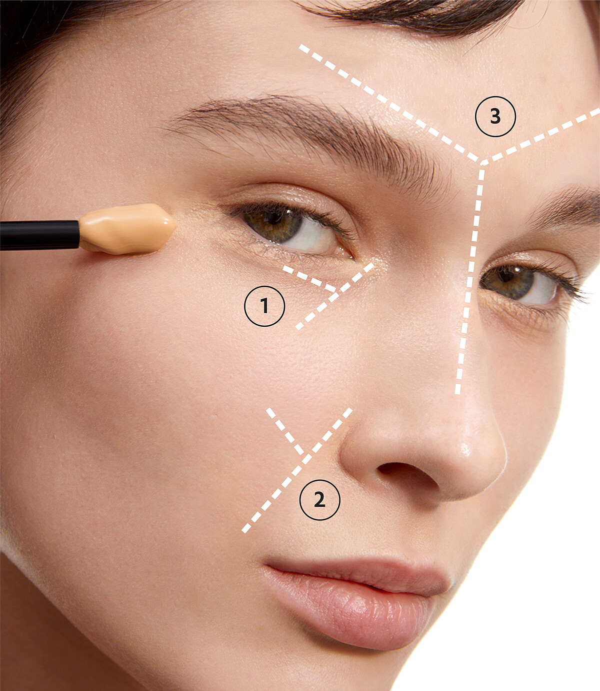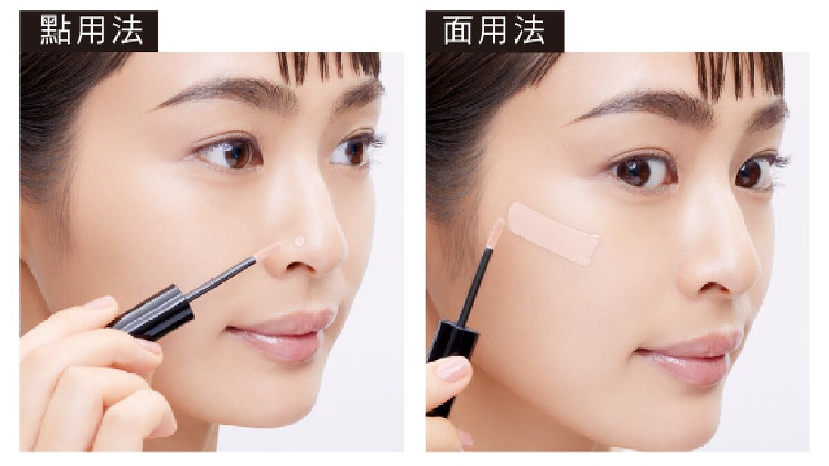 - 01. 刷棒的寬面在眼下倒三角區域畫出 「Y字」再均勻推開,利用刷棒斜壓 方式遮瑕黑眼圈、柔焦淚溝等細紋問題。