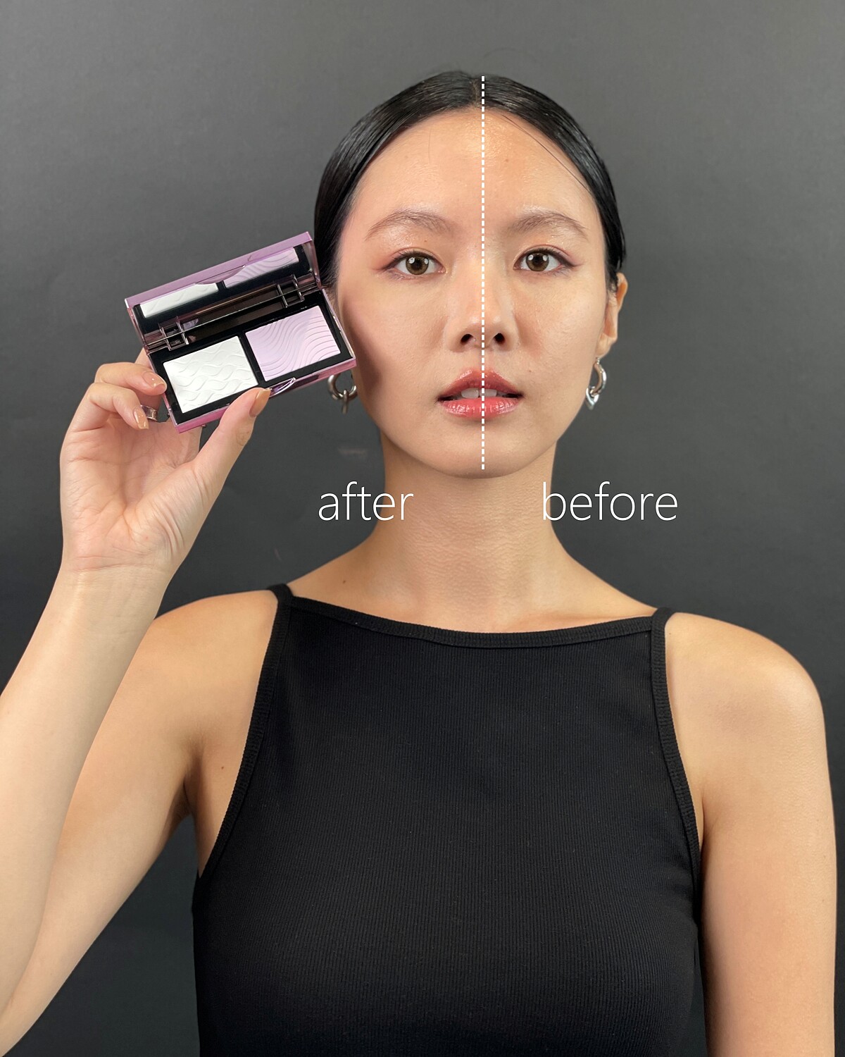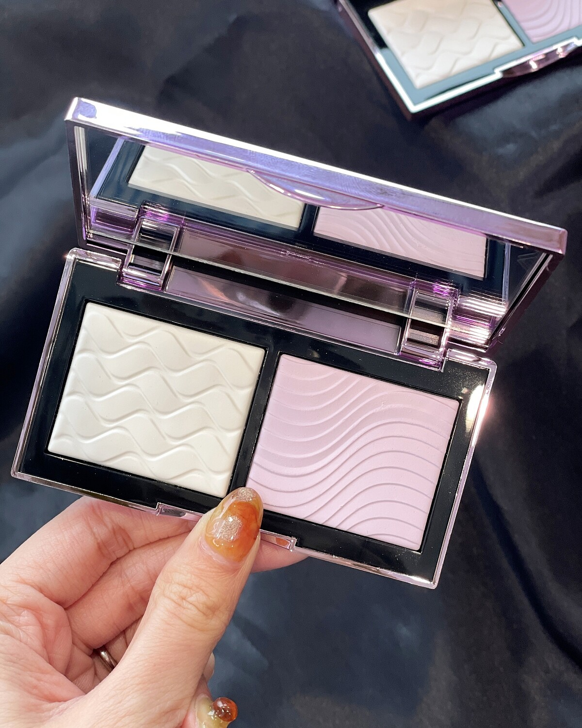 主打恰到好處的控油x修飾暗沉蠟黃,透明白定在輪廓、T字部位;絕絕紫則用來提亮眼下雙頰區,一餅就搞定。