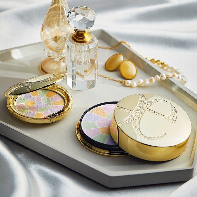 以親膚粉末為基底,輕柔貼合肌膚,並添加多重保濕成分,柔潤不乾燥,米白色珠光透出低調光感,展現波光粼粼的唯美妝效。也能作為局部打亮。