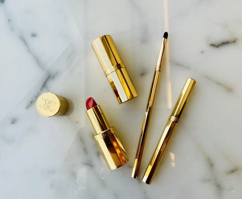 唇膏金色外殼靈感來自於18世紀末的法國古典主義,金色的唇膏外殼彷彿是高訂香水隨身瓶的縮小版,頂端同樣浮雕著品牌經典的TRIOMPHE Logo,中間則環繞著“LE ROUGE CELINE PARIS”字樣,十分精緻。