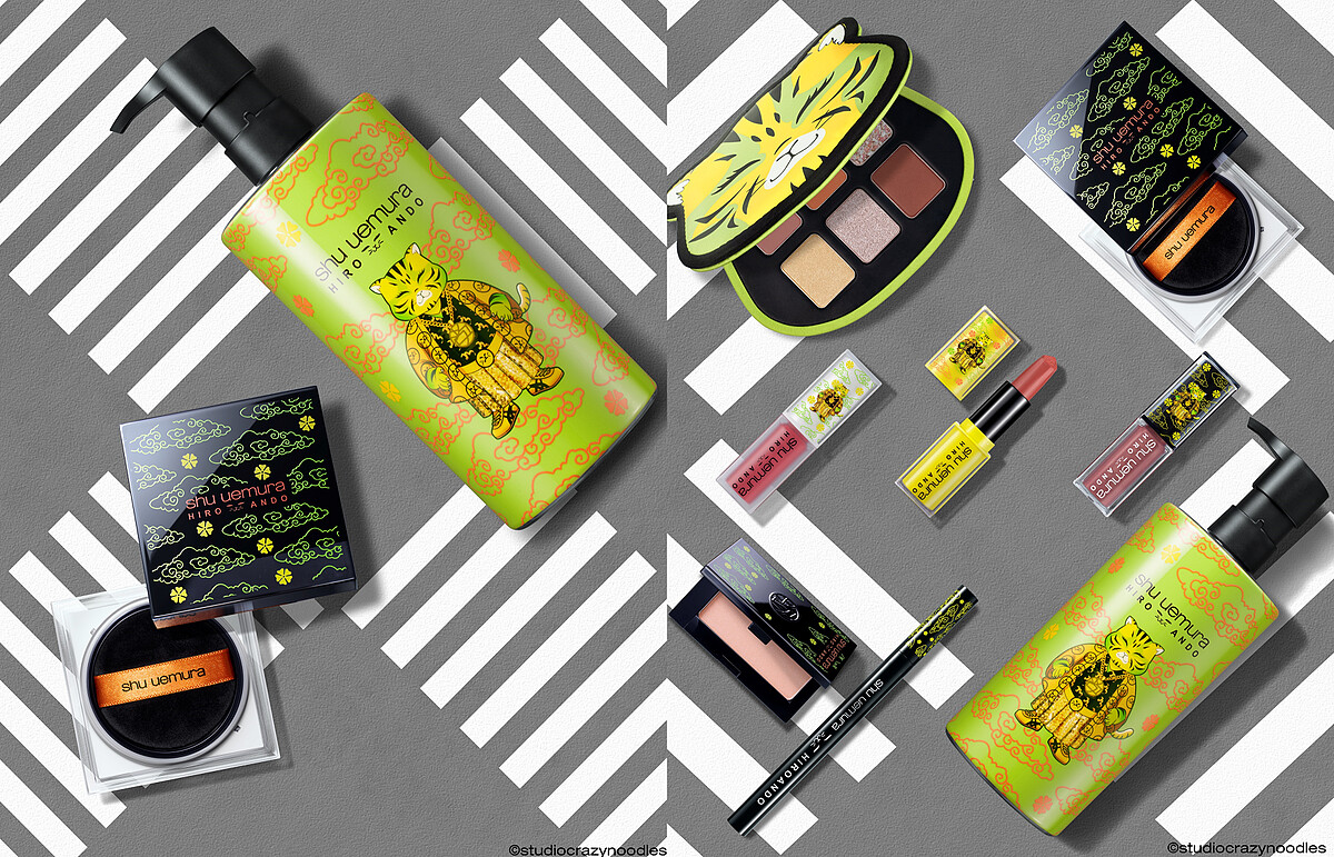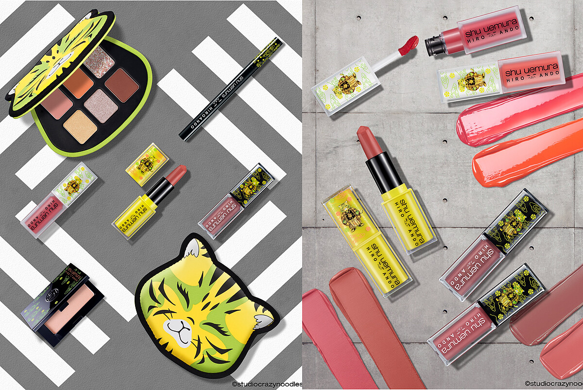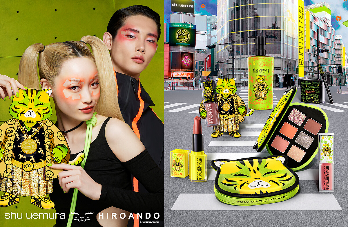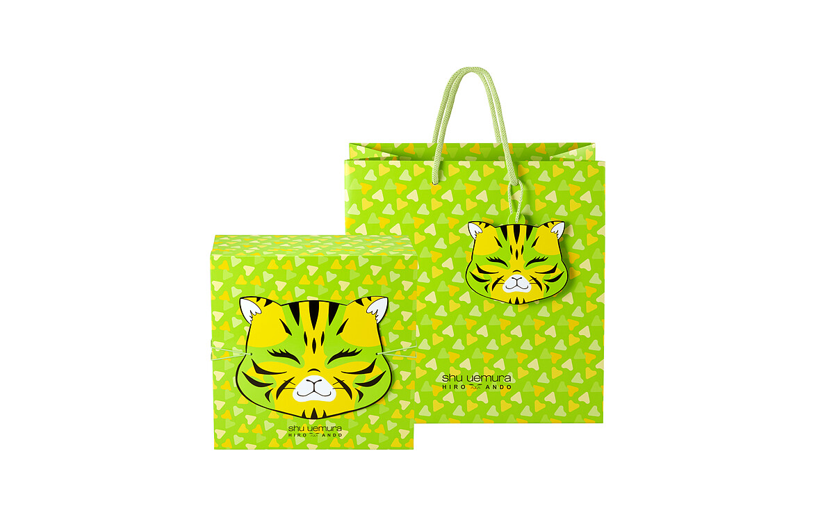 安藤.希羅 (Hiro Ando)這次更跨足彩妝界,專屬為植村秀的「潮虎東京限量系列」賦予嶄新生命力,他以象徵年輕世代的大膽無懼為創意靈感,並深受東京街頭所啟發,全新創造「shu shu tiger」萌寵聯名角色!穿著武士服、戴著嘻哈金鍊、還套上onistuka tiger潮鞋的shu shu tiger是象徵東京街頭文化的有趣作品,也融合了安藤.希羅最標誌性的古今交融創作風格。shu shu tiger潮酷可愛的身影散佈在「潮虎東京限量系列」商品的包裝設計中,再搭配高調入眼的螢光綠色為系列主視覺,絕對是近期彩妝控熱議度最高的潮流聯名話題!