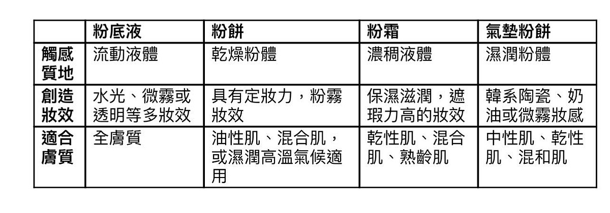底妝類型總盤點:粉底液、粉餅、粉霜、氣墊哪個適合我?