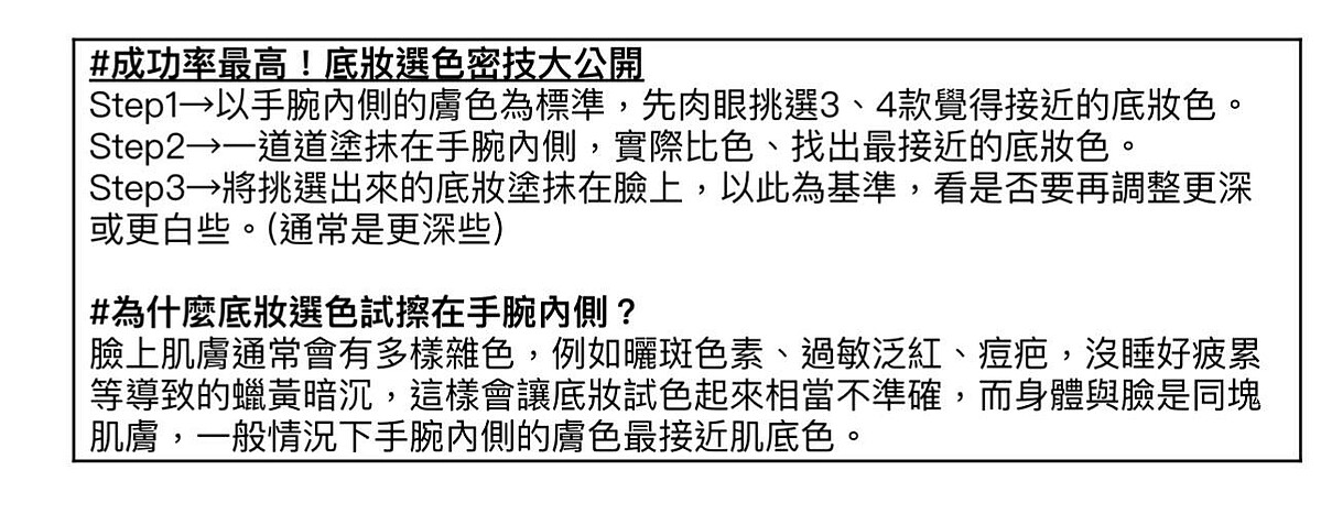 3、 最重要的「選色」,接近肌底色妝效最棒