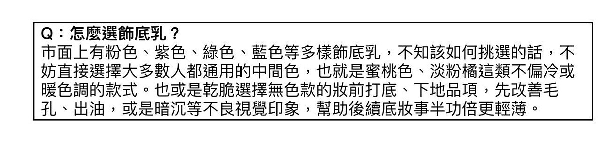 選擇一款適合自己的飾底乳,跟挑對粉底顏色同樣重要!游絲棋指出這點在台灣尤其影響很大,因為溫度、濕度的關係,常容易導致肌膚有出油、毛孔粗大、泛紅、色素暗沉的問題,看起來臉色花花雜雜的不均勻。先以飾底乳或是妝前下地這類產品,將肌膚狀況調理校正,後續底妝就能以更少量來創造出通透的好膚質妝容。