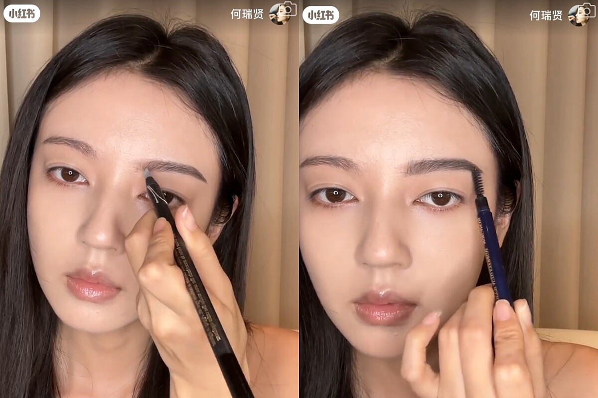 何瑞賢不管是畫什麼風格的妝容,都會很清楚地把眉峰畫出來,藉此增加臉的立體度,在眉毛製造一個轉折的點,在視覺上會讓臉看起來更小,除此之外,眉頭會盡量保留根根分明的眉毛,畫眉時也是一筆一筆的勾勒,讓毛流能更清楚被看到,製造出自然的野生眉,也因為眉峰明顯,看起來多了一股清冷感。