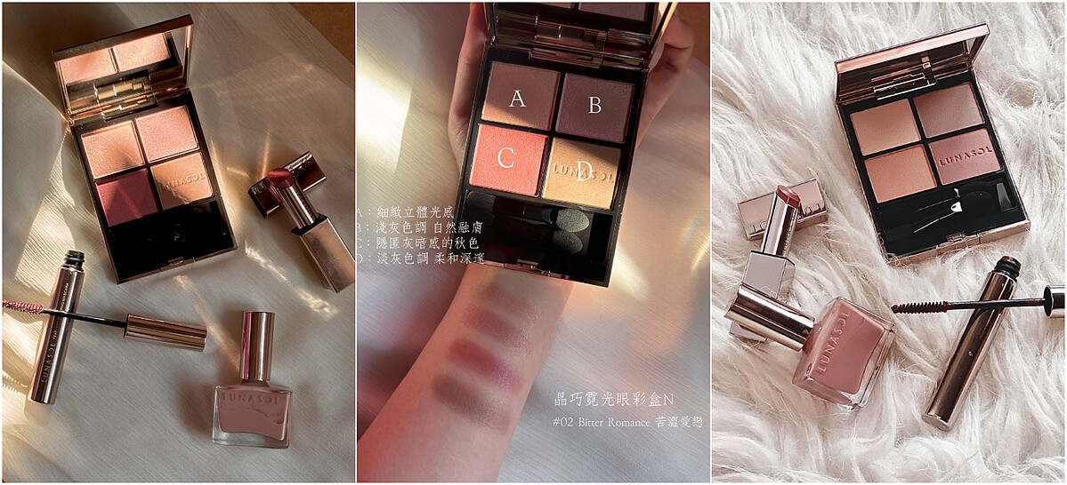 LUNASOL秋妝新色的唯美色澤與輕透質地,從眼彩、唇瓣一直到指尖都能染上濃濃秋日的溫柔氣息。我很喜歡晶巧霓光眼彩盒N#02苦澀愛戀,一如既往的綿密粉質,新手也能輕鬆駕馭不失手,摻入秋日光影的粉紅,能隨心所欲為雙眸添上一抹光彩!持彩豐潤魅唇膏#09溫暖擁抱,帶粉紅調的大地色溫潤又華麗,是一款讓人每天都想用的漂亮豐潤唇膏。晶巧凝色指采能輕鬆平整地塗抹,以低彩度色澤襯托出秋季的溫柔爛漫。濃密纖長羽扇睫毛膏秋季限定新色#EX01無花果,巧妙融合紅、粉色的冷灰調非常特別,令眼神更精緻又生動,是讓我對LUNASOL秋妝一用傾心的焦點喔。