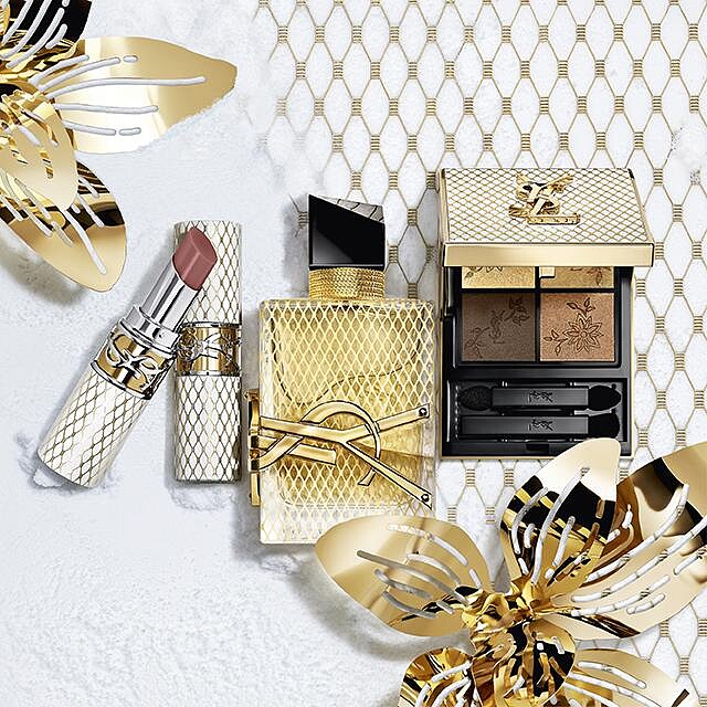 散發暖陽花香調的「自由不羈淡香精」是YSL香氛的經典,今年聖誕自由不羈換上金奢蕾絲包裝,經典金色 CASSANDRE LOGO 沿著瓶身俐落的角度彎曲 鑲嵌,瓶頸的金色頸鍊如同YSL女性脖子上的藝術品般,交織著叛逆與浪漫同時並存的金奢蕾絲花紋。