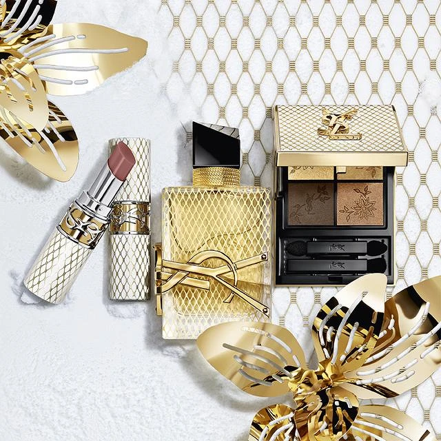 散發暖陽花香調的「自由不羈淡香精」是YSL香氛的經典,今年聖誕自由不羈換上金奢蕾絲包裝,經典金色 CASSANDRE LOGO 沿著瓶身俐落的角度彎曲 鑲嵌,瓶頸的金色頸鍊如同YSL女性脖子上的藝術品般,交織著叛逆與浪漫同時並存的金奢蕾絲花紋。