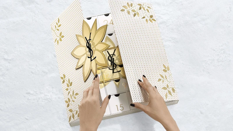 以優雅雪白外盒搭配耀眼的金奢蕾絲花紋與映照YSL LOGO的雪絨花,24格抽屜設計每格都藏著驚喜,包含熱門彩妝正裝、訂製香水和頂級保養系列等等。