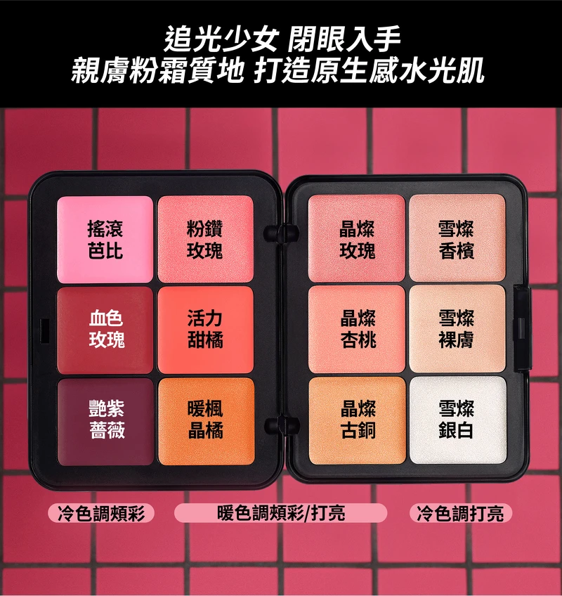 延續粉霜盤保濕輕透霜狀質地和不易脫妝特性,嚴選百搭的6色頰彩及6色打亮,且以冷色調和暖色調區分,連彩妝新手都能輕鬆調製出高級精緻的透膚感腮紅,打造由內而外展現出來的好氣色。