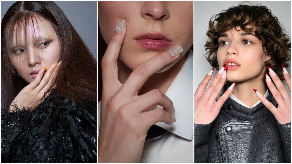 指彩延伸更多實驗語言。Dullaert 的微型珠飾宛如霧凍水晶;Stella McCartney 用紅尖撞裸色甲;Giambattista Valli 以透明甲搭配紅邊線,拉長手指比例;Viktor & Rolf 的蜜桃與黃檸漸變甲,則讓未來氛圍呼之欲出。