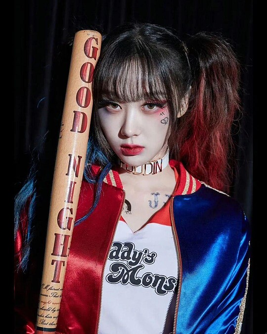 Giselle 化身 DC 經典反派「小丑女」哈莉奎茵(Harley Quinn),紅藍雙色馬尾、煙燻妝、還有臉上的塗鴉符號,細節滿分!造型上她穿上紅藍亮面夾克、內搭白色字母 T-shirt、手拿棒球棍, 以她一貫的酷帥氣質詮釋這位混亂卻魅惑的角色,將小丑女的性感與叛逆演繹的超完美。