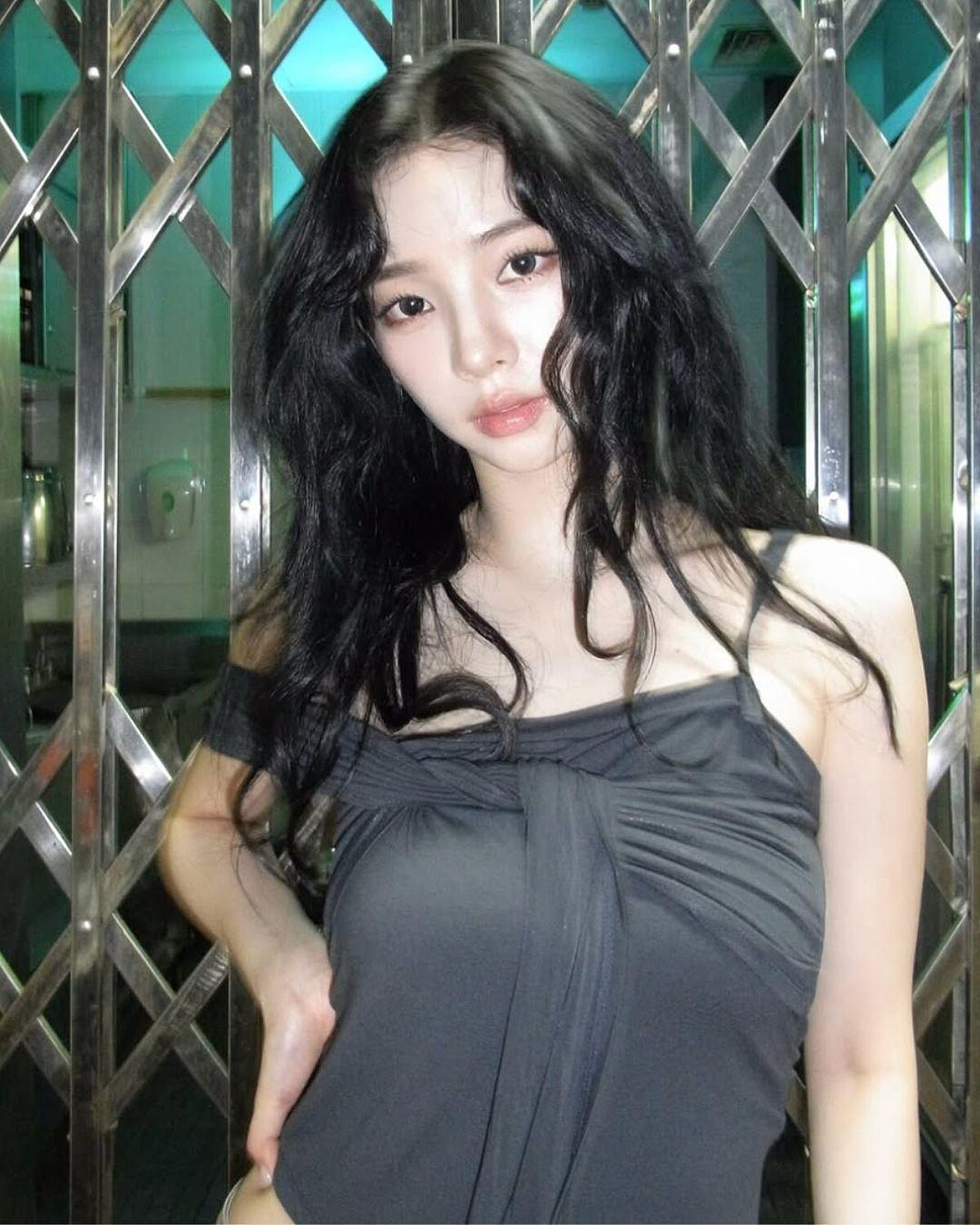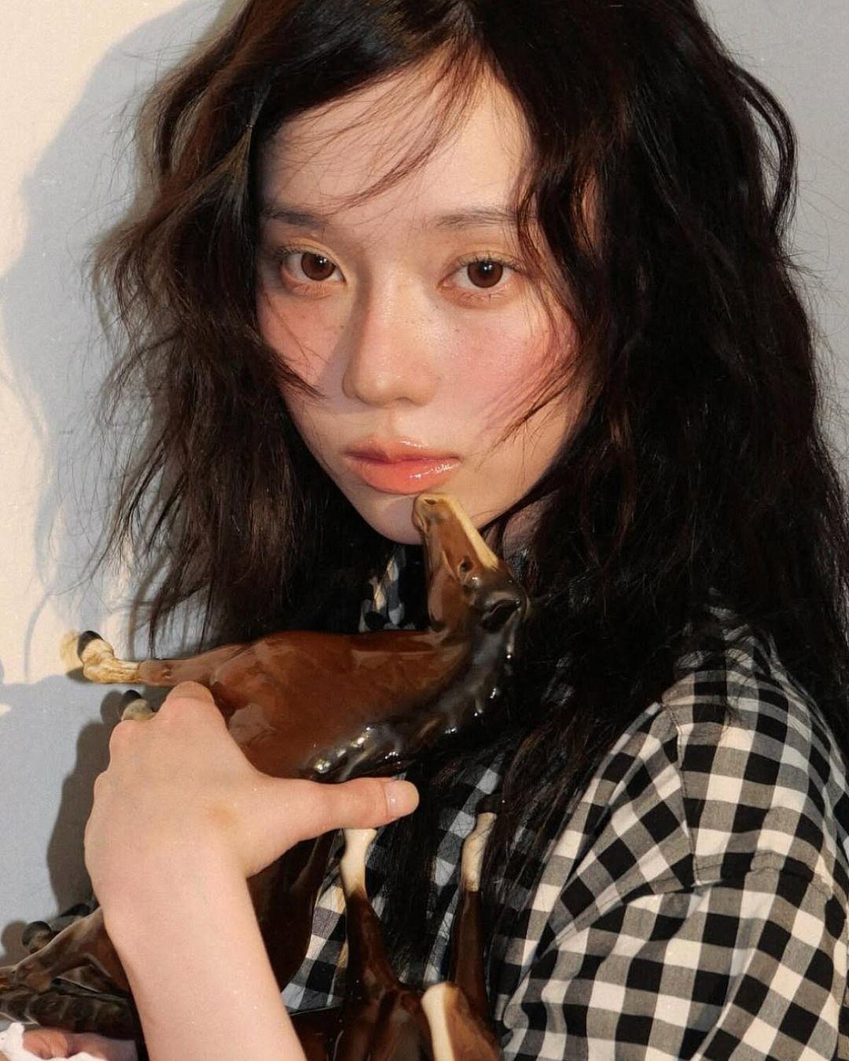 Winter 的這個造型幾乎完全捨棄睫毛妝感,只有以淡棕色眼影暈染出柔和陰影,搭配霧面裸唇與微亂髮絲,呈現一種剛睡醒般的自然慵懶感。