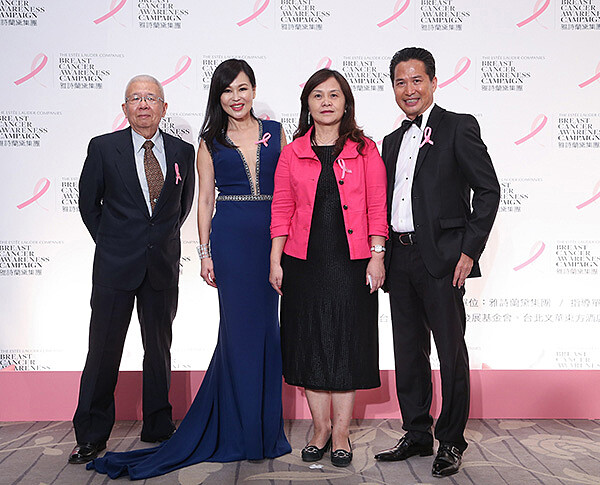 (左起)台灣癌症臨床研究發展基金會董事長 陳博明先生、雅詩蘭黛集團公共事務總監 蔡易伶女士、衛服部國民健康署副署長 游麗惠女士與雅詩蘭黛集團執行董事總經理 陳國憫先生出席雅詩蘭黛集團2015粉紅絲帶慈善晚宴