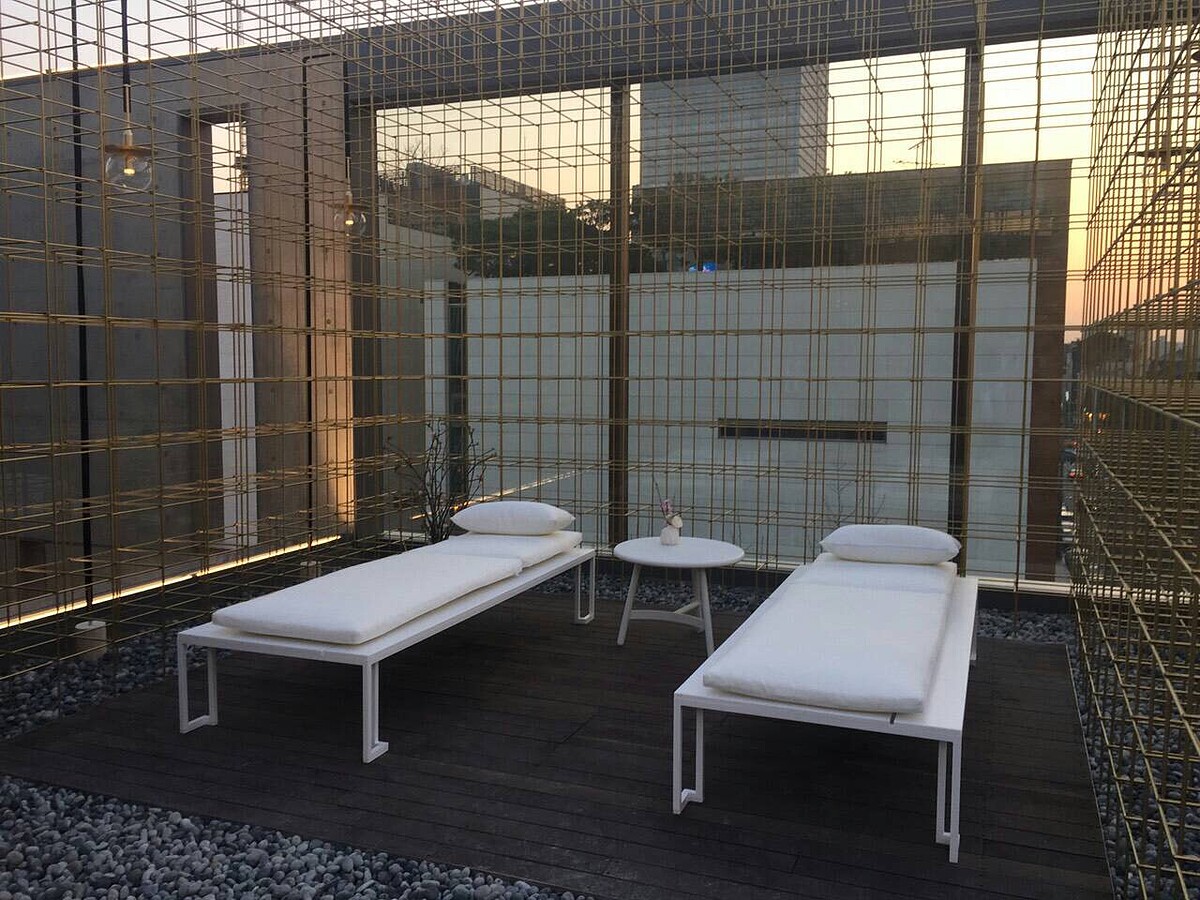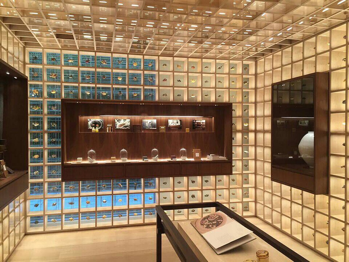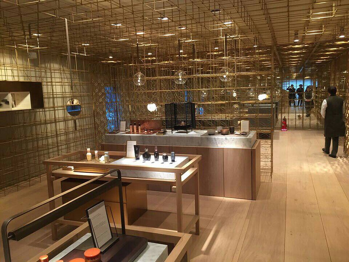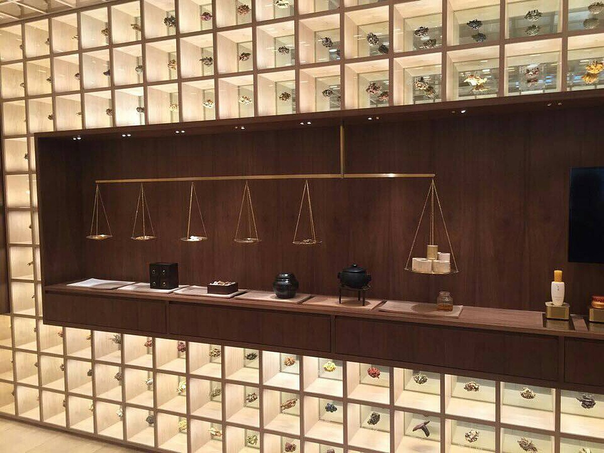 設計師是由國際設計大獎常勝軍---夫妻檔Neri&Hu如恩設計研究室完成,內外結構皆以黃銅為主要材質,傳遞出雪花秀做為美妝市場引路人的決心。從小在臺灣長大的胡如珊,喜歡將生活中的小細節,從一個語境帶到另一個語境,再說不同的故事。