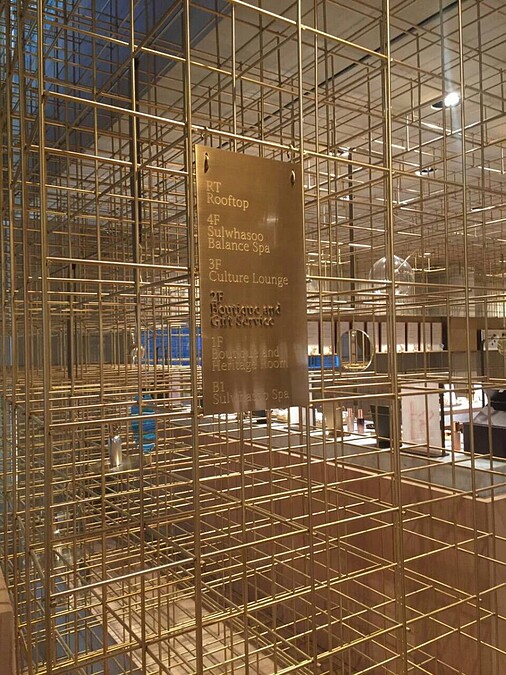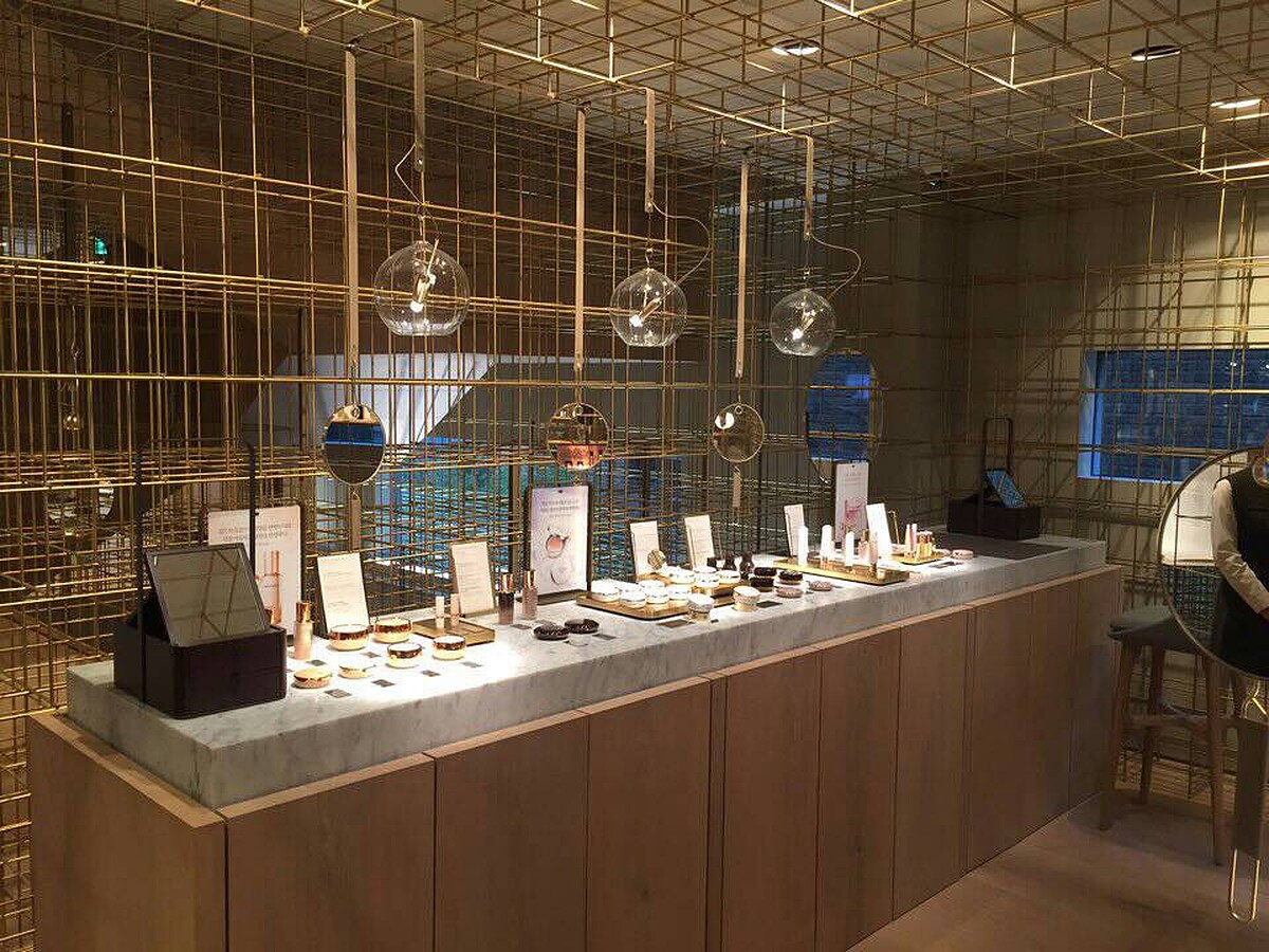 以燈籠為概念,一盞璀璨明燈,在黑暗中發光發亮的靈感,雪花秀耗資台幣三億五千萬打造出全韓最大坪數品牌概念旗艦店,隨著黃銅細線透視,讓柔和光線照在這些絲軸上,映照出沉靜光芒,帶來寧靜的愉悅。