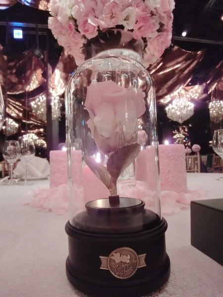 之前林心如就曾為這間花店拍過大片,絕美風格讓許多人誤以為是婚紗照。歸寧宴也特別挑選了店家相當著名,以玫瑰花製成的「你偷了我的心永生花音樂盒」,呼應會場的玫瑰佈置。