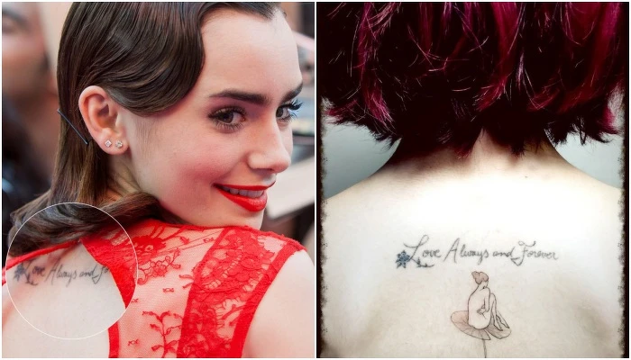 後背上刻劃著Love Always and Forever刺青據說是和前男友Jamie Campbell Bower在一起的時候刺的。