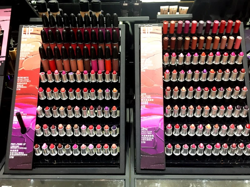 MAC的唇彩上百支的陳列,乍看之下不知從何挑選起,其實MAC很細心地有依照質地、依照色系來陳列。依照質地大概有,水潤光、霧面、金屬光澤等等選擇;而色系則有粉測、裸色、莓果色、土色、特殊色等。