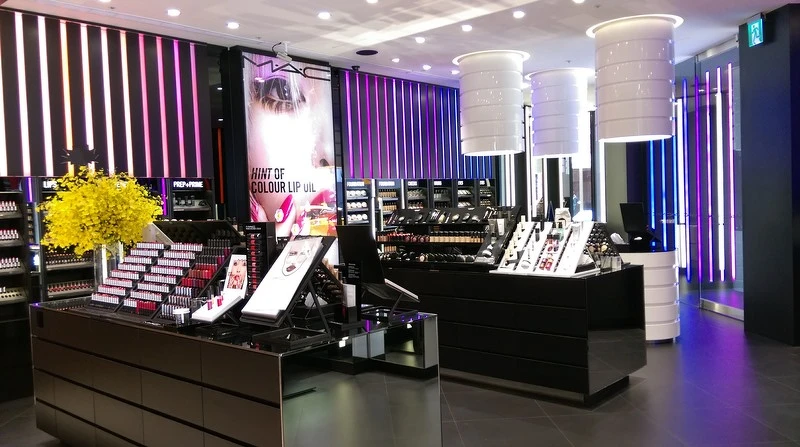 強調彩妝不設限的M.A.C在打造旗艦店時,以讓客人減少距離感為目標,並以霓虹燈條打造出未來時尚感,是第一間引進國外全新店裝概念的設計。