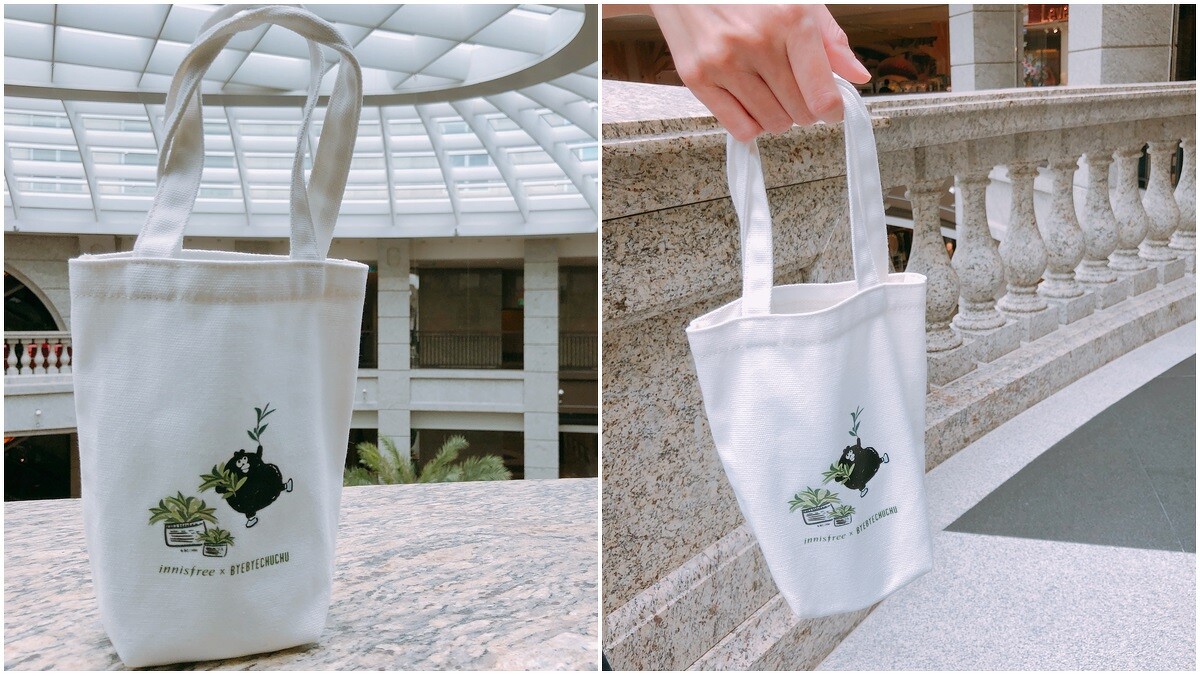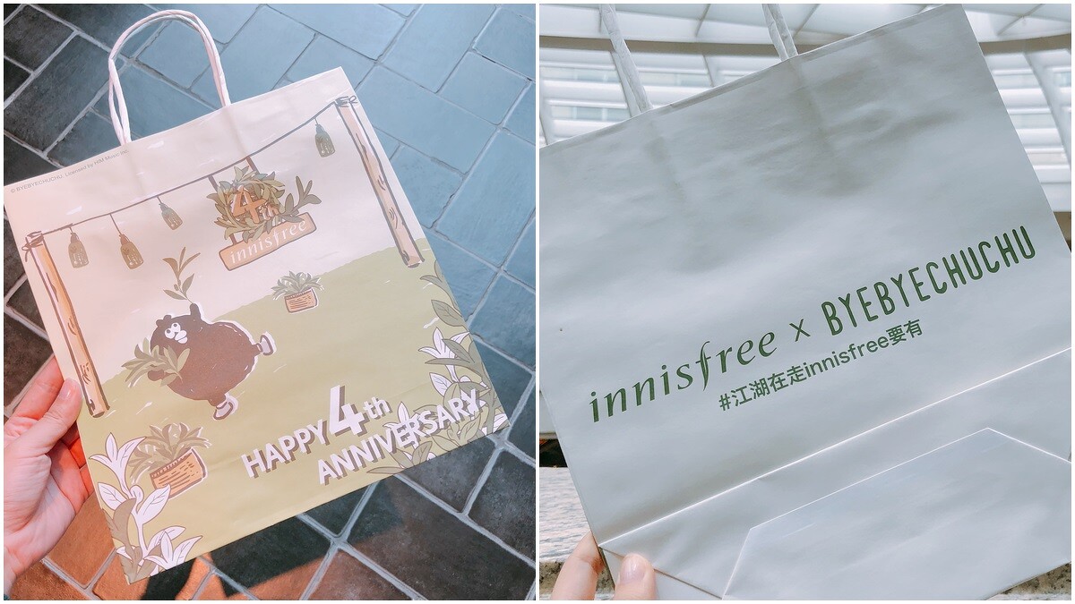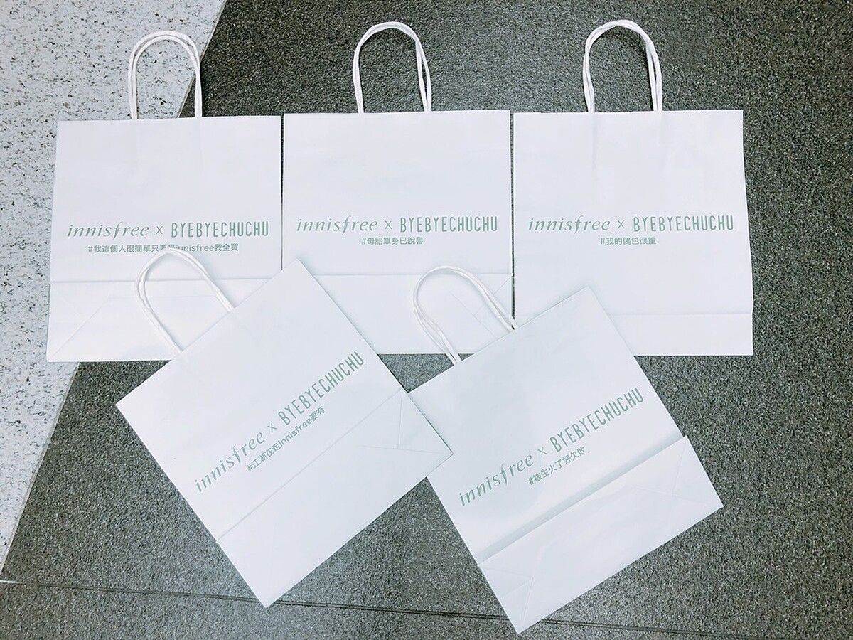 原本的紙袋一面畫上奧樂雞插圖,另一片則加上有趣的hashtag,一共有5款,分別寫上:#江湖在走innisfree要有、#我的偶包很重、#被生火了好欠敗、#母胎單身已脫魯、#我這個人很簡單只要是innisfree我全買。而且只要消費、部現金額就可獲得,據說以「#江湖在走innisfree要有」最受歡迎,更有不少人收集了全套。