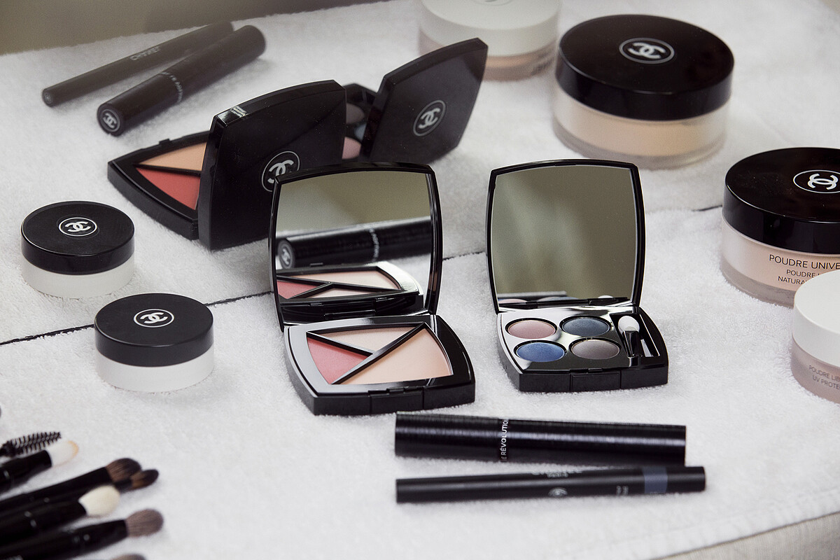 底妝:香奈兒活力光采保濕水粉底SPF15、香奈兒時尚玩色顏彩盤、香奈兒伸縮式雙重遮瑕刷、香奈兒伸縮式兩用修容刷、香奈兒立體光修片筆。