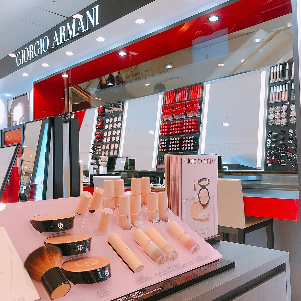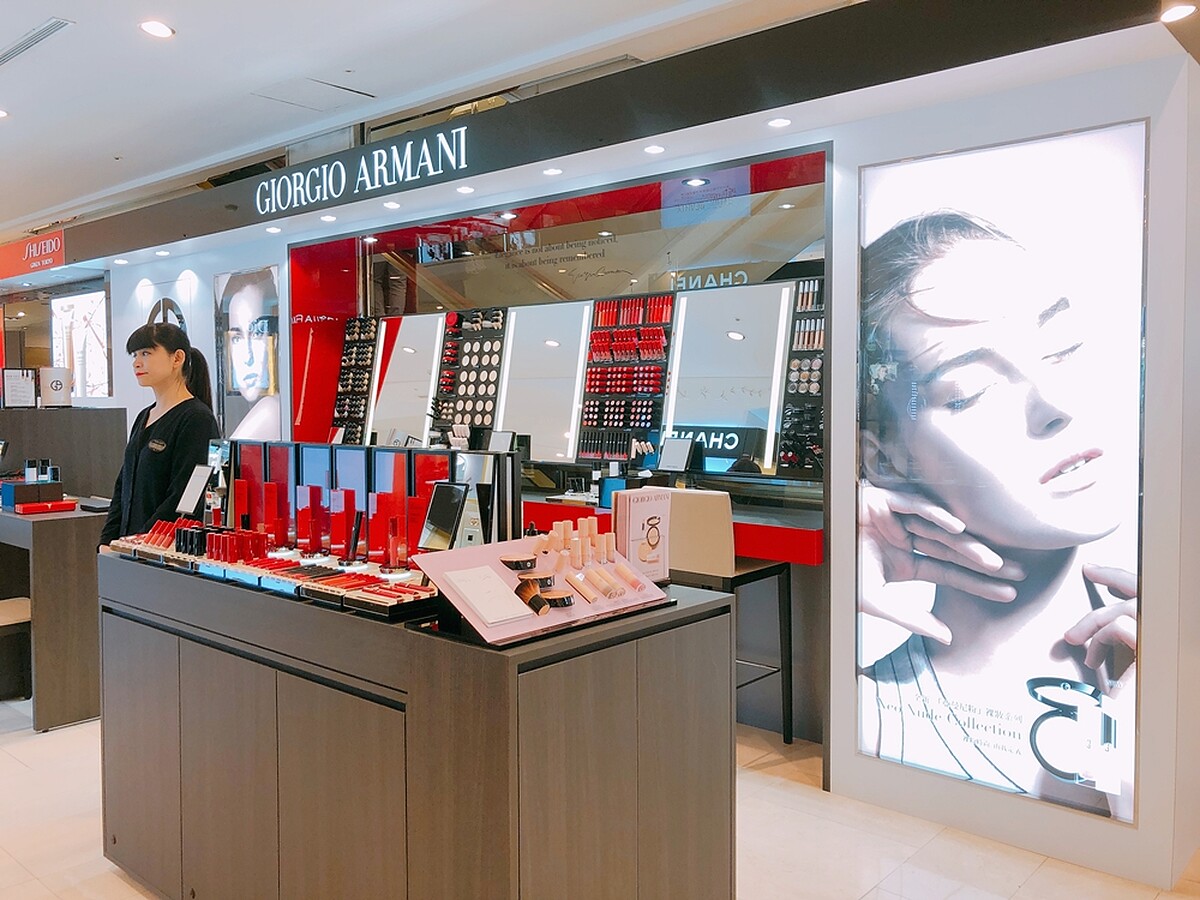 Giorgio Armani位於台北遠東SOGO忠孝館1樓新開「頂級精品美妝櫃」,產品完整,包含彩妝、保養、香水等產品與獨家頂級保養服務通通有。目前在2樓的「亞曼尼紅彩妝櫃」仍將繼續保留,以彩妝為主,也是全台唯一以亞曼尼紅為概念的彩妝專屬櫃點。