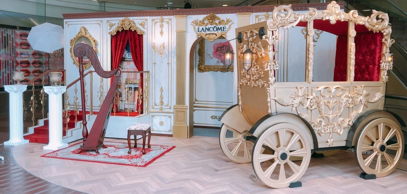 為了讓每個女人都能體驗法式迷人的彩妝造型,蘭蔻舉辦多年的玩美女人時尚攝影棚今年以「經典洛可可.風華閃耀」為主題,重金復刻法國宮廷的場景,包括古董馬車、法式廊柱、暗紅色絨布與金色法式雕花線板場景一應俱全,並且從6月開始展開全台巡迴活動。