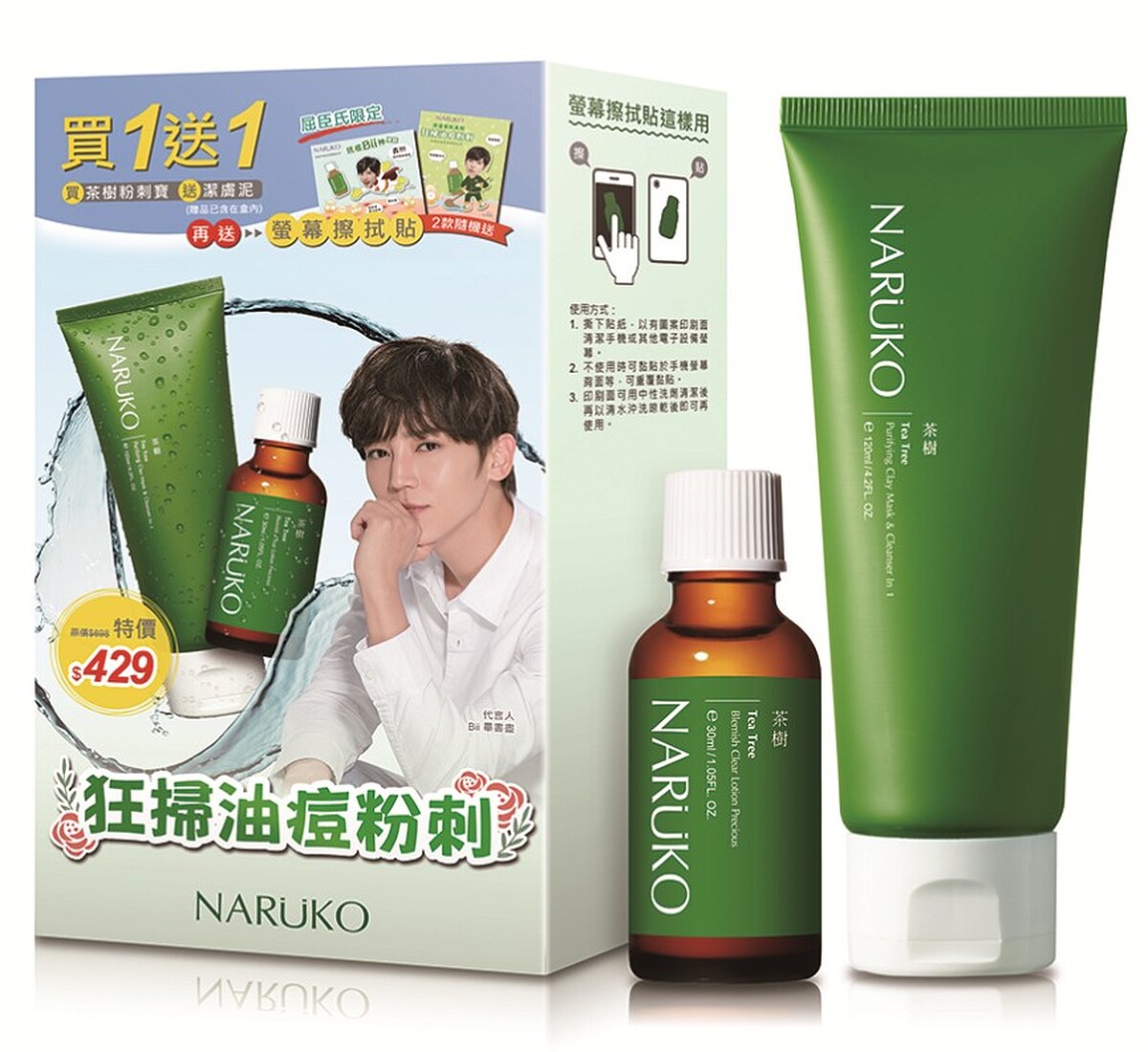 NARUKO屈臣氏限定專賣的茶樹粉刺擦擦潔淨組,內含抗痘明星商品茶樹抗痘粉刺寶及茶樹抗痘敷面潔膚泥,加贈Bii畢書盡螢幕擦拭貼,狂掃油痘粉刺就靠它!