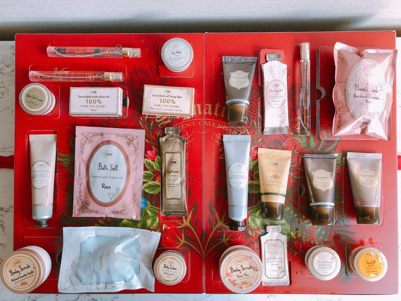 12/1 茉莉花語洗髮乳30ml、12/2 茉莉花語身體乳液15ml、12/3 熾熱璀焰麝香香水12ml、12/4 SABON經典身體磨砂膏70g、12/5 SABON經典橄欖油手工皂25g、12/6 以色列綠玫瑰絲綢身體乳液8ml、12/7 橙花漫舞沁涼保濕凝露15ml、12/8 蒟蒻潔顏海棉、12/9 亞麻花語織物香氛噴霧12ml、12/10 以色列綠玫瑰身體乳液30ml(條裝)、12/11 玫瑰浴鹽30g、12/12 樟木薄荷極潤護足霜15ml、12/13 海藻防禦抗氧活膚精露1.5ml、12/14 迷你SABON經典護手霜30ml(條裝) 、12/15 SABON經典花香礦晶浴鹽30g、12/16 長效修護保濕噴霧12ml、12/17 香蘋薰衣草沐浴油30ml、12/18 玫瑰茶語身體磨砂膏70g、12/19 死海礦泥橄欖油手工皂25g、12/20 茉莉花語沐浴油30ml(條裝)、12/21 賦活臉部磨砂膏15ml、12/22 茉莉花語潤髮乳15ml、12/23 海藻防禦舒敏活膚乳15ml、12/24 迷你茉莉花語護手霜30m(條裝)