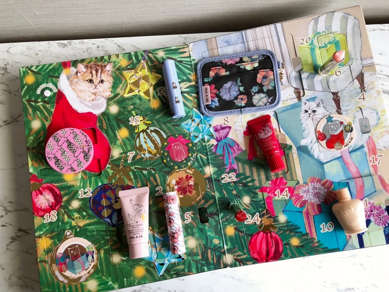 12/1-限量隔離乳、12/3-小桃貓限量蜜粉餅、12/5和12/23-限量唇膏盒、12/6-護唇膏、12/9和12/13和12/21-卡片式貓咪臉頰彩、12/11 PAUL & JOE限量花卡夾、12/16限量唇蜜、12/19限量護手霜、12/24-西洋橘保濕唇膏。