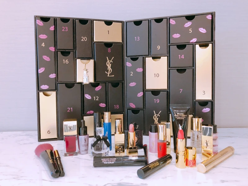 YSL今年首度加入聖誕月曆戰局,台灣就同步引進,相當有誠意。倒數月曆外觀顏色以YSL招牌色的黑色搭配金色為主,內容也從彩妝、保養到香水一應俱全,包含時尚印記絲絨唇露、慾望巴黎香氛、奢華緞面唇膏等等,可說非常豐富。