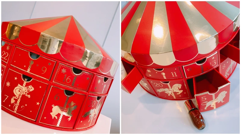 雅詩蘭黛推出的「幸福聖誕旋轉盒」,以遊樂園中象徵幸福的旋轉木馬為靈感來源,透過繽紛亮眼的遊樂園倒數月曆打造濃濃聖誕幸福氛圍,不過在台灣並沒有上市販售,只要從11/20起靠櫃體驗彩妝新品即可免費玩一次「幸福聖誕旋轉盒」,每一格都有獎,100%中獎率,還有機會獲得唇膏或眼影正貨!